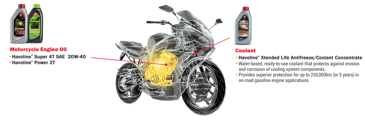 It's important to use the right product for optimal performance. That's why we offer a range for your motorcycle's unique needs. Whether it’s Caltex's Havoline engine oils, brake and clutch fluids or coolants, we’ll help protect your engine wherever you go. *Always follow the motor oil grade and oil change intervals recommended in your vehicle owner’s manual.