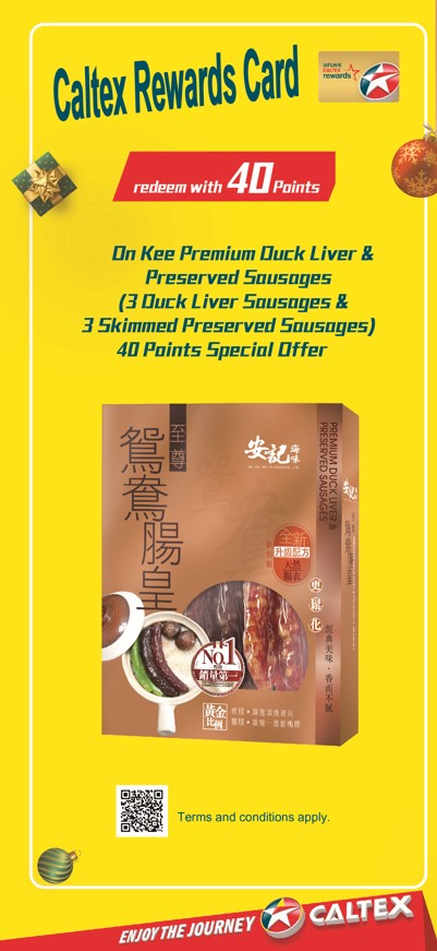 From December 1 to 31, 2025, members of Caltex Rewards Card can use 40 Caltex Rewards Points to redeem a pack of On Kee Premium Duck Liver & Preserved Sausages (3 duck liver sausages and 3 skimmed preserved sausages).