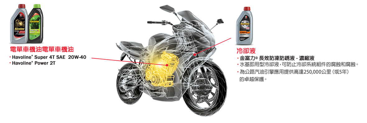 It's important to use the right product for optimal performance. That's why we offer a range for your motorcycle's unique needs. Whether it’s Caltex's Havoline engine oils, brake and clutch fluids or coolants, we’ll help protect your engine wherever you go. *Always follow the motor oil grade and oil change intervals recommended in your vehicle owner’s manual.