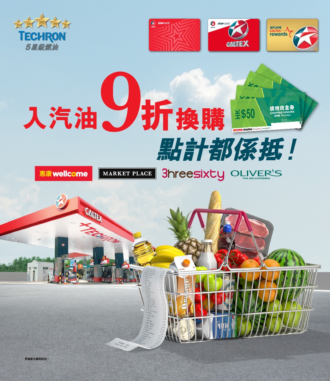 即日起至2026年3月31日,加德士加FUN咭、私人能源咭及VIP再賞咭會員於加德士加油站入特配Techron® 汽油滿HK$600,即可以九折換購指定超市現金券(每次最多只限換購四張HK$50現金券)。