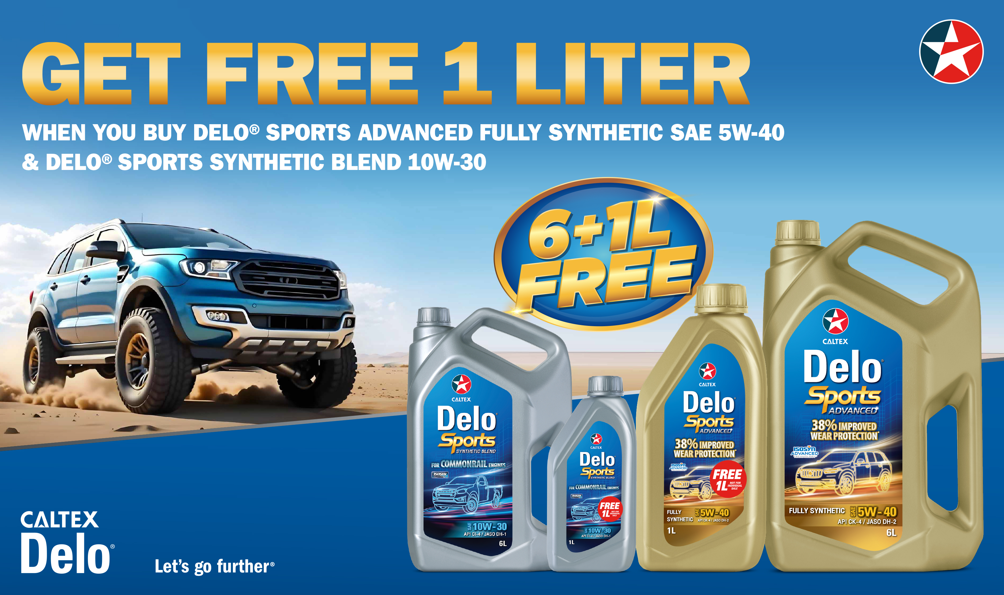 - Customer gets a FREE 1 Liter of Caltex Delo Sports with every purchase of 6L + 1L participating pack. All participating packs have a 6+1L violator on the label. Total pack size is 7L.