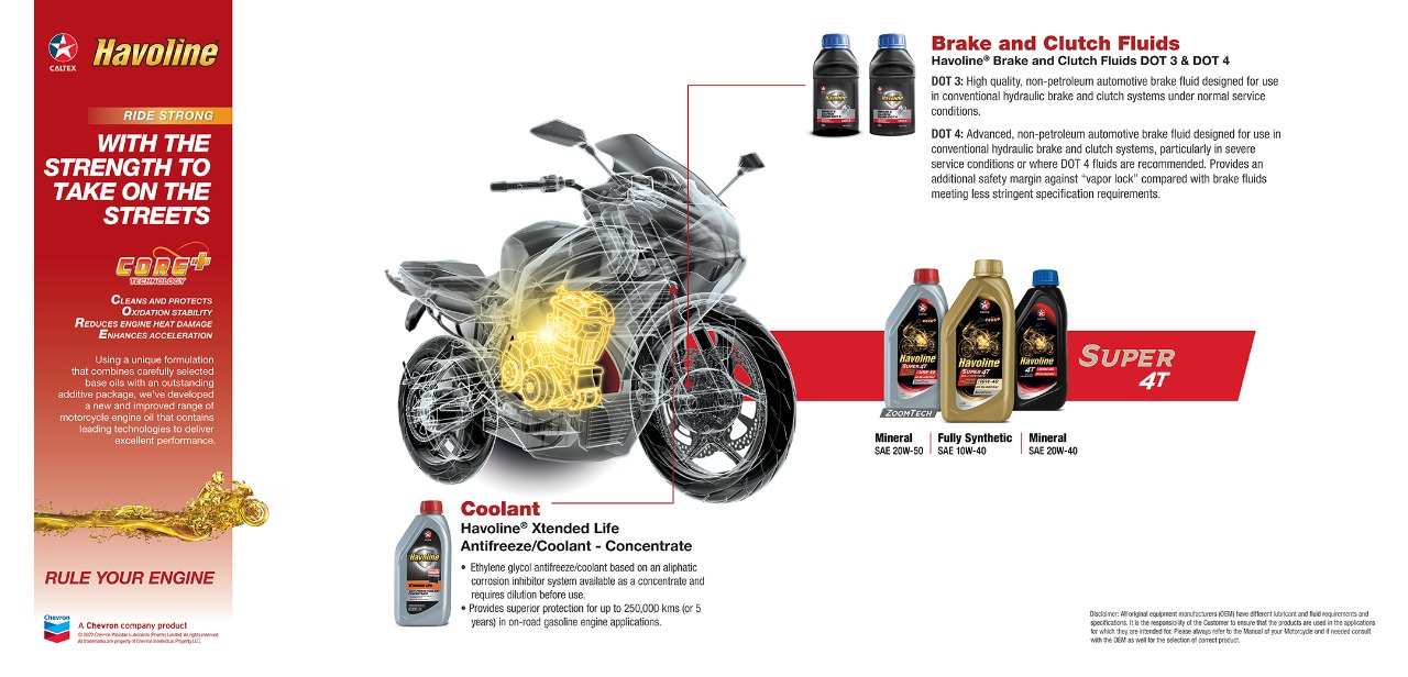 Havoline motorcyle and scooter oils with C.O.R.E plus technology give you consistent and reliable protection and performance in every bottle.