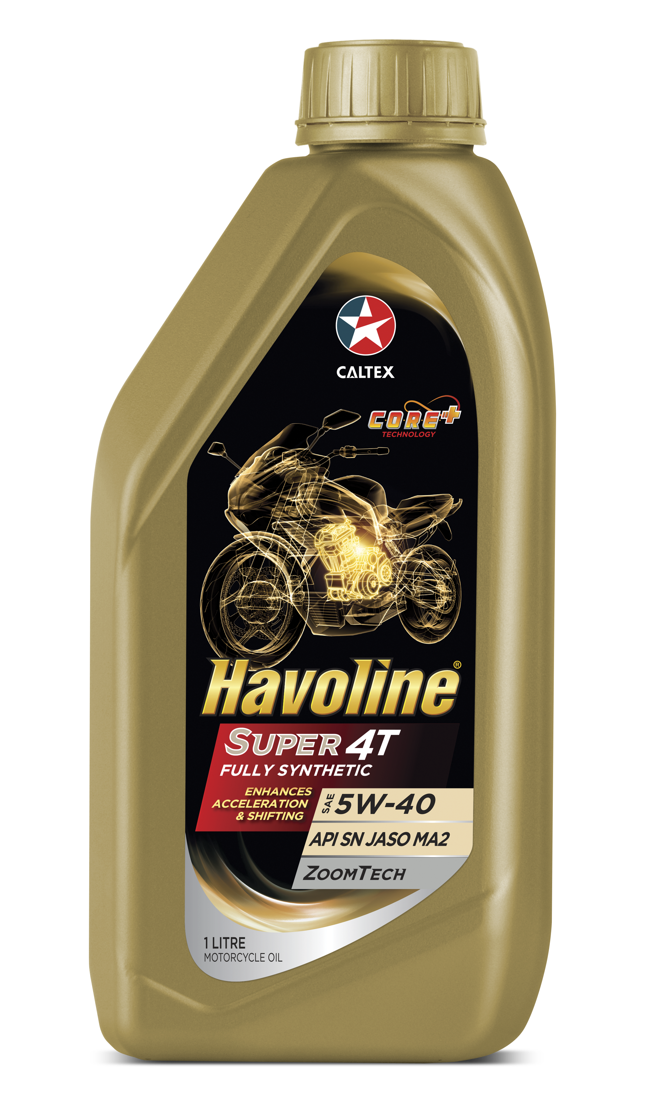 Havoline® Super 4T Fully Synthetic is a premium fully synthetic oil with Havoline C.O.R.E.+ Technology, specially formulated to suit the demanding needs of high performance motorcycles in all city riding conditions.