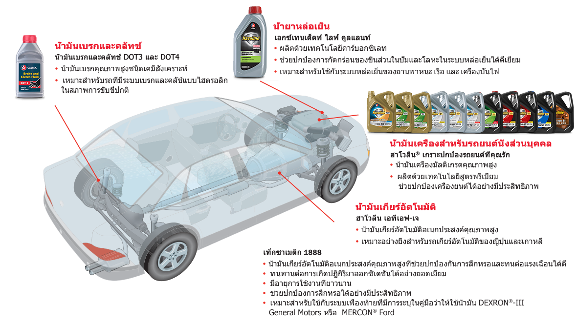 การเลือกผลิตภัณฑ์ที่เหมาะสำหรับรถของคุณก็เพื่อให้รถยนต์ของคุณทำงานได้เต็มประสิทธิภาพ นั่นเป็นเหตุผลที่เราพัฒนาผลิตภัณฑ์ให้ตรงกับความต้องการ ไม่ว่าจะเป็นน้ำมันเครื่องคาลเท็กซ์ ฮาโลวีน น้ำมันเบรกและครัทช์ น้ำมันเกียร์และพวงมาลัย หรือแม้แต่น้ำยาหม้อน้ำ เราให้คำมั่นที่จะให้การปกป้องเครื่องยนต์ และทุกการเดินทางของคุณ