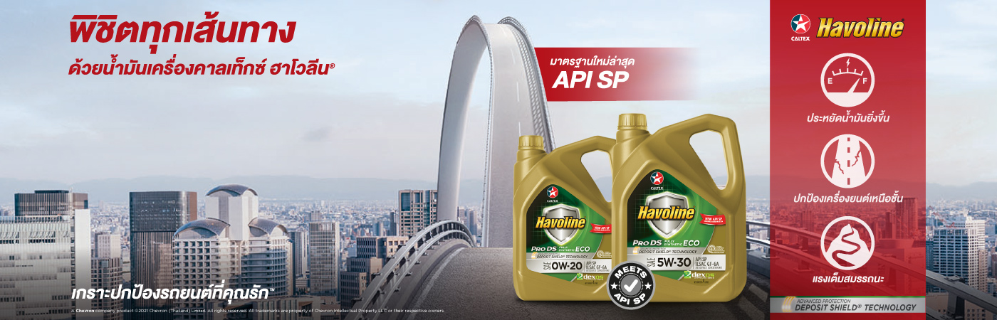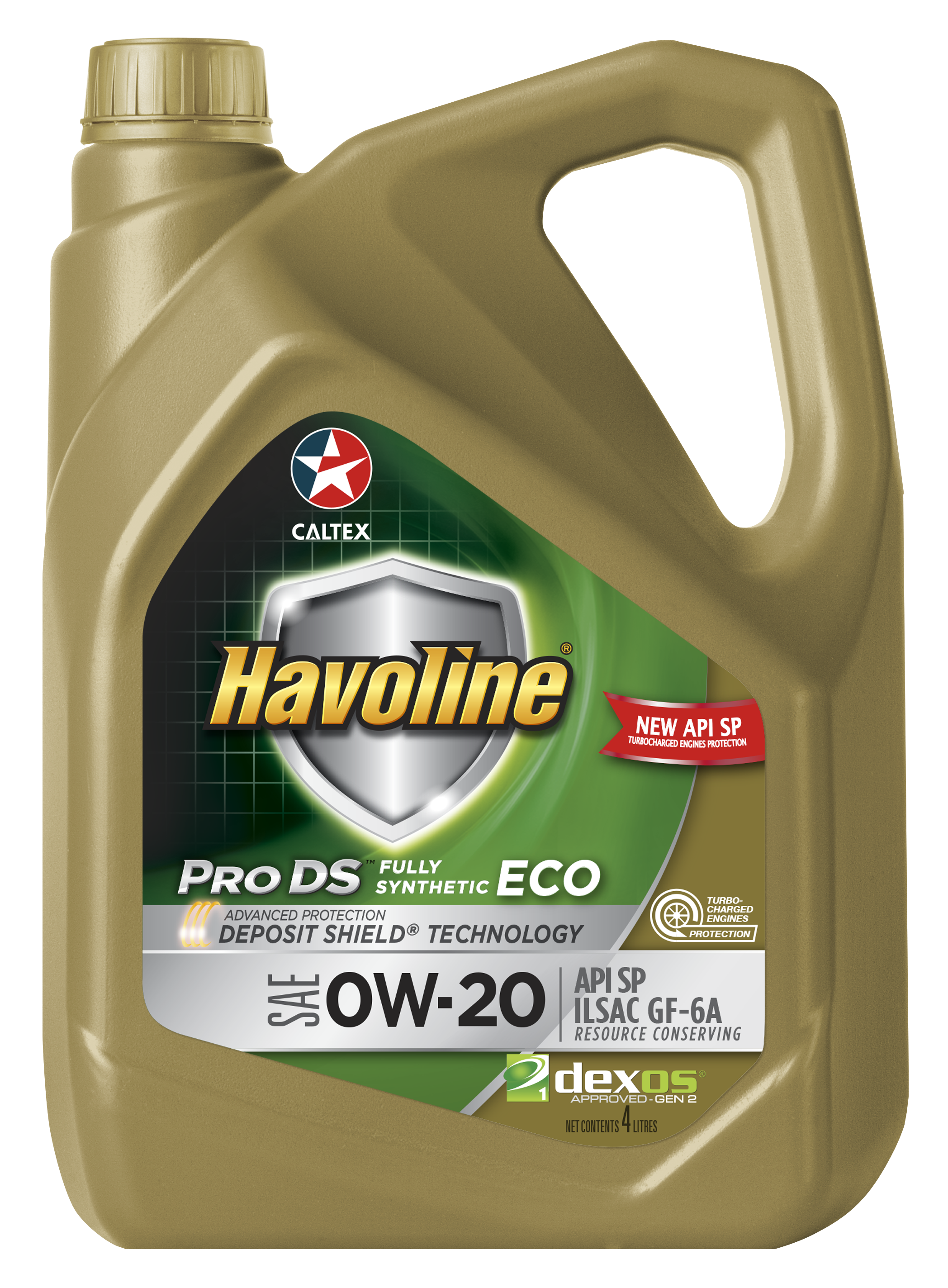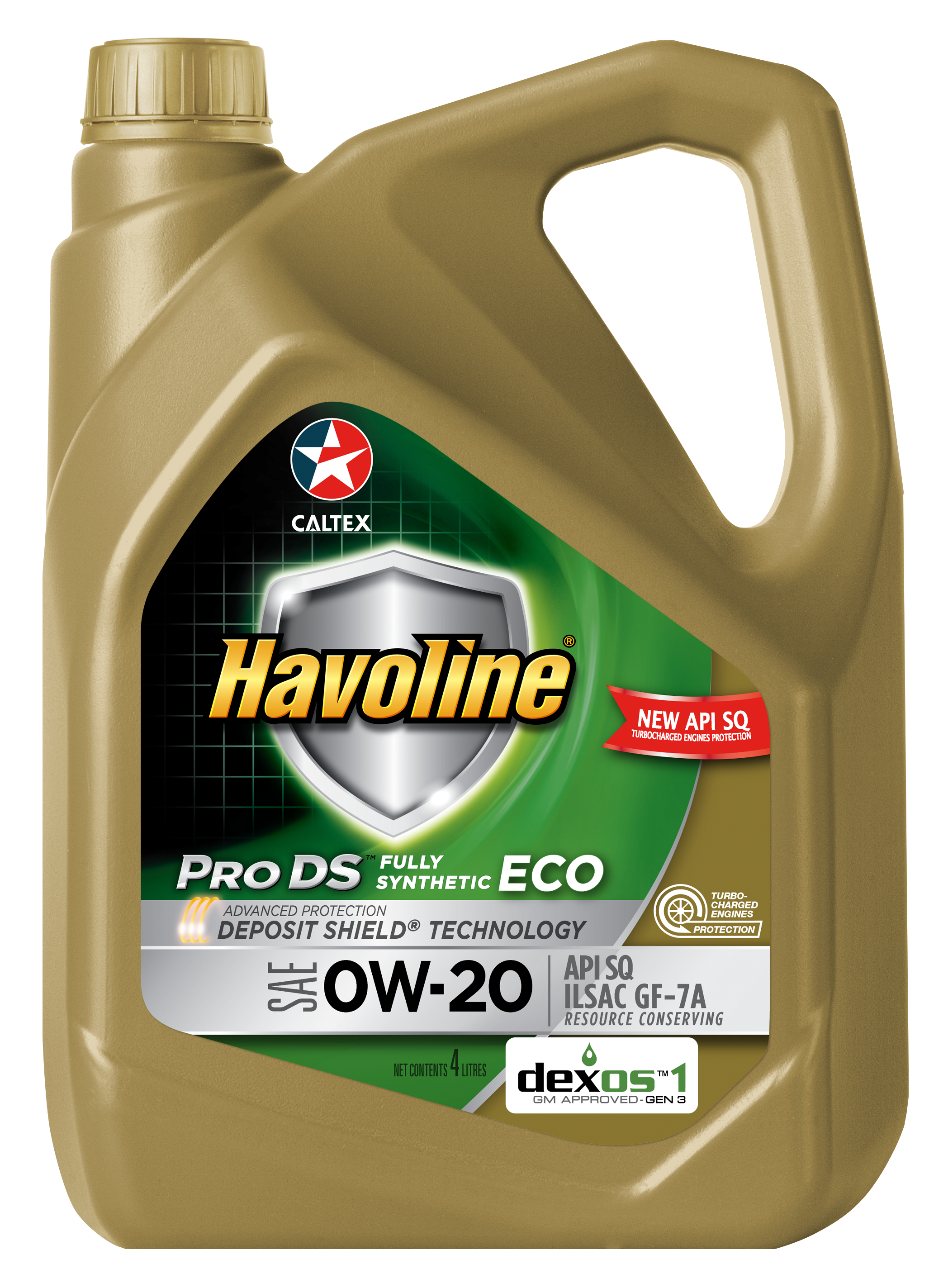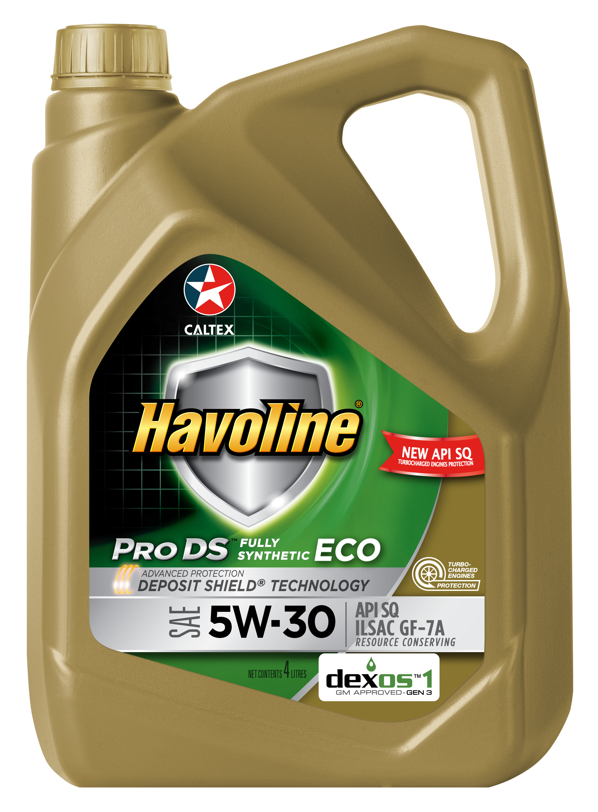 น้ำมันเครื่องคาลเท็กซ์ ฮาโวลีน® โปรดีเอส ฟูลลี่ ซินเธติก อีโค่ SAE 5W-30 น้ำมันสังเคราะห์แท้ 100% มาตรฐานล่าสุด API SQ / ILSAC GF-7A มีเทคโนโลยี Deposit Shield® ซึ่งออกแบบเฉพาะสำหรับเครื่องยนต์เบนซินที่มีระะบบฉีดตรง GDI และเทอร์โบชาร์จเจอร์