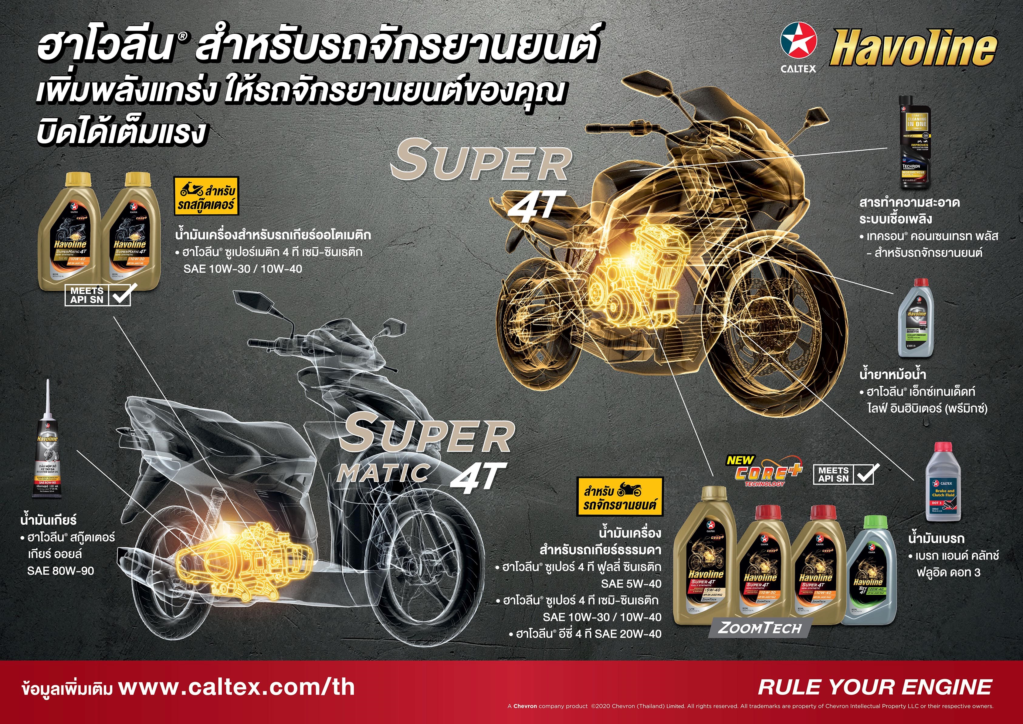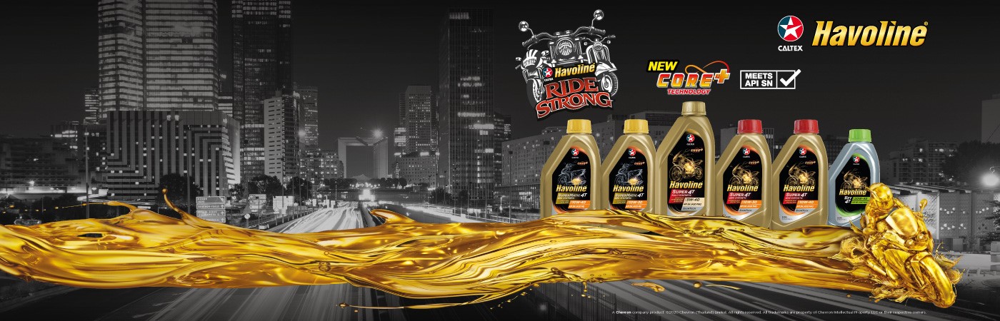 น้ำมันเครื่องสำหรับรถจักรยานยนต์ ฮาโวลีน®® จากคาลเท็กซ์ มีเทคโนโลยี C.O.R.E.+ และ ZoomTech ที่ช่วยเพิ่มสมรรถนะให้เครื่องยนต์และมีความเชื่อถือได้