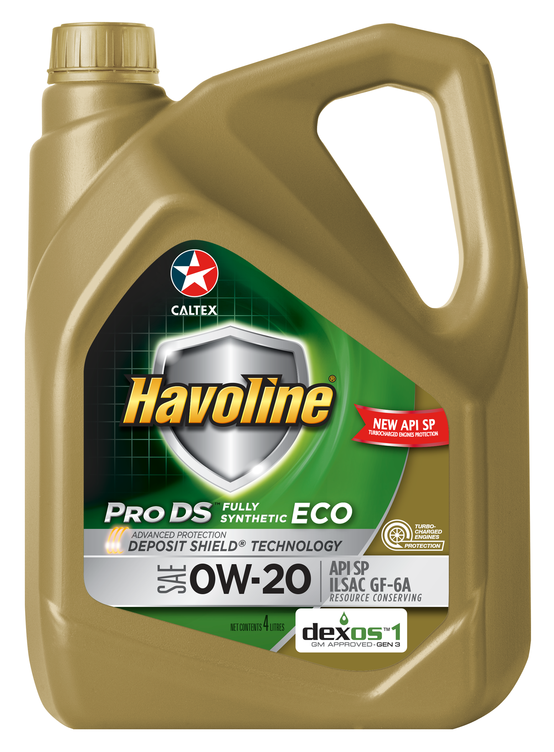 น้ำมันเครื่องคาลเท็กซ์ ฮาโวลีน® โปรดีเอส ฟูลลี่ ซินเธติก อีโค่ SAE 0W-20 น้ำมันสังเคราะห์แท้ 100% มีเทคโนโลยี Deposit Shield® ที่ออกแบบมาเป็นพิเศษสำหรับเครื่องยนต์เบนซินที่มีระะบบฉีดตรง GDI และเทอร์โบชาร์จเจอร์ สามารถทำงานได้อย่างเต็มประสิทธิภาพด้วยมาตรฐานล่าสุด API SQ / ILSAC GF-7A ซึ่งเป็นมาตรฐานสูงสุดของน้ำมันหล่อลื่นในกลุ่มนี้