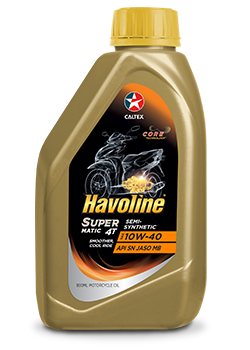 น้ำมันเครื่องคาลเท็กซ์ ฮาโวลีน® ซูเปอร์เมติก 4ที เซมิ-ซินเธติก มาตรฐาน API SN ผลิตด้วย C.O.R.E.+Technology สูตรเฉพาะสำหรับรถจักรยานยนต์เกียร์อัตโนมัติ ทนความร้อนได้ดี ช่วยเพิ่มอัตราเร่ง และประหยัดเชื้อเพลิง