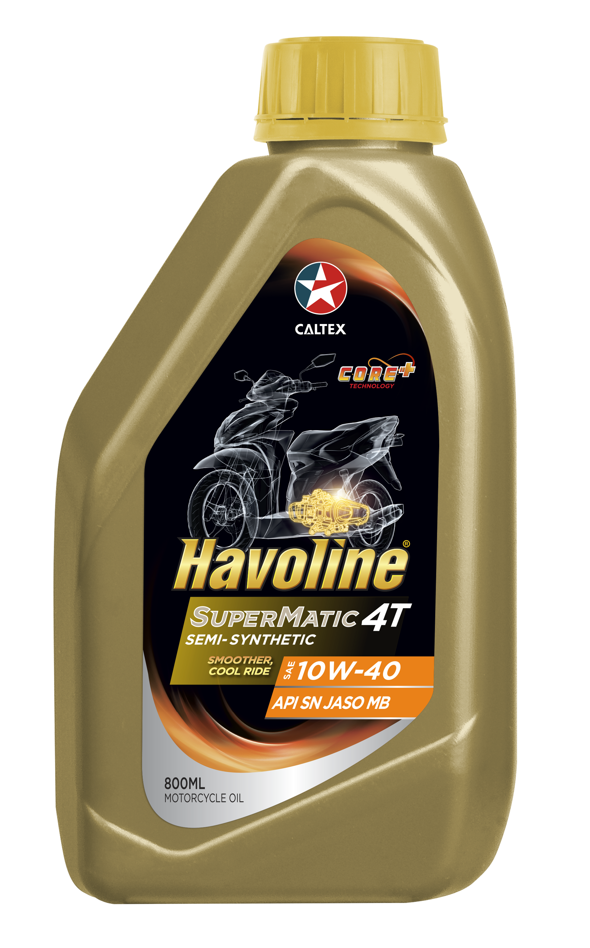 น้ำมันเครื่องคาลเท็กซ์ ฮาโวลีน® ซูเปอร์เมติก 4ที เซมิ-ซินเธติก มาตรฐาน API SN ผลิตด้วย C.O.R.E.+Technology สูตรเฉพาะสำหรับรถจักรยานยนต์เกียร์อัตโนมัติ ทนความร้อนได้ดี ช่วยเพิ่มอัตราเร่ง และประหยัดเชื้อเพลิง