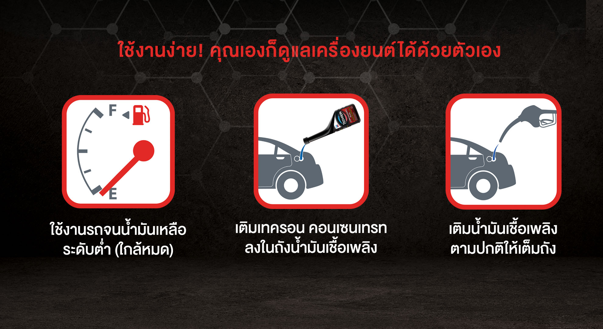 คุณอาจต้องมีความรู้เรื่องเคมีเพื่อทำความเข้าใจสูตรเคมีที่อยู่เบื้องหลังเทครอน® คอนเซนเทรท พลัส แต่ถ้าคุณอยากจะใช้ก็ไม่ยาก แค่เติมลงในถังน้ำมันของรถยนต์คุณเท่านั้น