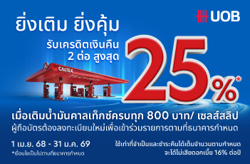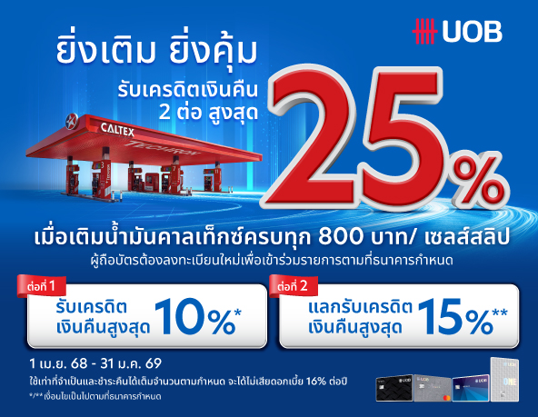 • เครดิตเงินคืน 1% สำหรับบัตรเครดิตยูโอบีประเภทอื่นๆ เมื่อชำระค่าเติมน้ำมันที่สถานีบริการน้ำมันคาลเท็กซ์ทุก 800 บาท/เซลส์สลิป