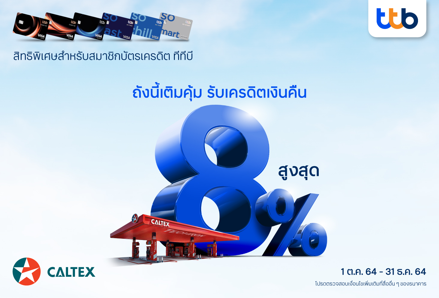 บัตรเครดิตทีทีบี เติมน้ำมันสุดคุ้มที่ปั๊มคาลเท็กซ์!! รับเครดิตเงินคืนสูงสุด 5% และรับคะแนนพิเศษสูงสุด 1,800 คะแนน